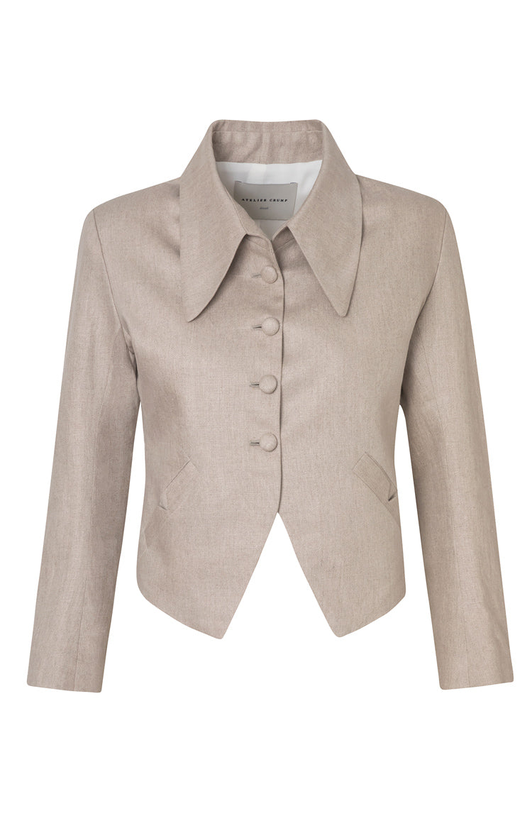 Chaqueta corta con nuestro cuello icónico tritón y botones forrados. Elaborada en una base textil de lino. Es una prenda con un corte clásico, ligera, y fresca. Funciona como un básico que elevara tu look y te hará ver sofisticada. La modelo lleva una talla S y mide 1,75. Esta prenda es hecha en Colombia en condiciones de trabajo éticas.