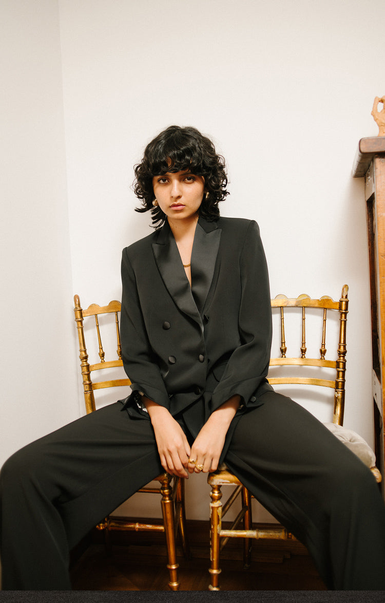 Chaqueta tipo esmoquin en crepé. Diseñada con una silueta entallada, llega a la cadera, tiene bolsillos y doble abotonadura. La solapa es en satín y el forro es en poliéster. La modelo lleva una talla S y mide 1,75. Esta prenda es hecha en Colombia en condiciones de trabajo éticas.