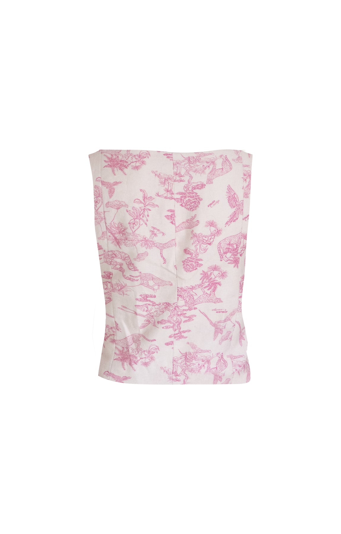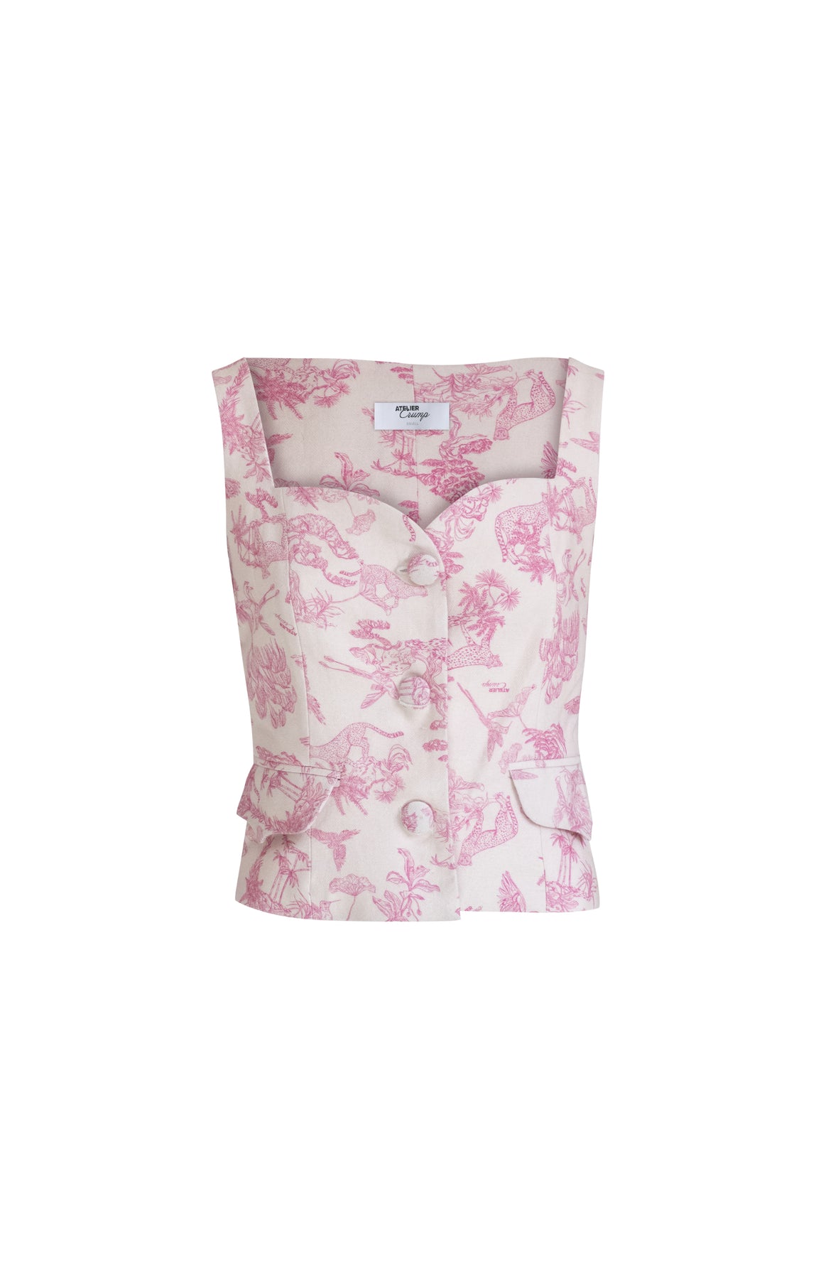 Este chaleco con escote corazón y bolsillos Crump ofrece una silueta elegante y cómoda. La mezcla eco amigable de algodón y lino es respirable y biodegradable. Su estampado toile de jouy con motivo de guepardos y colibríes le da un toque unico y sofisticado. La modelo lleva una talla S y mide 1,75. Esta prenda es hecha en Colombia en condiciones de trabajo éticas.