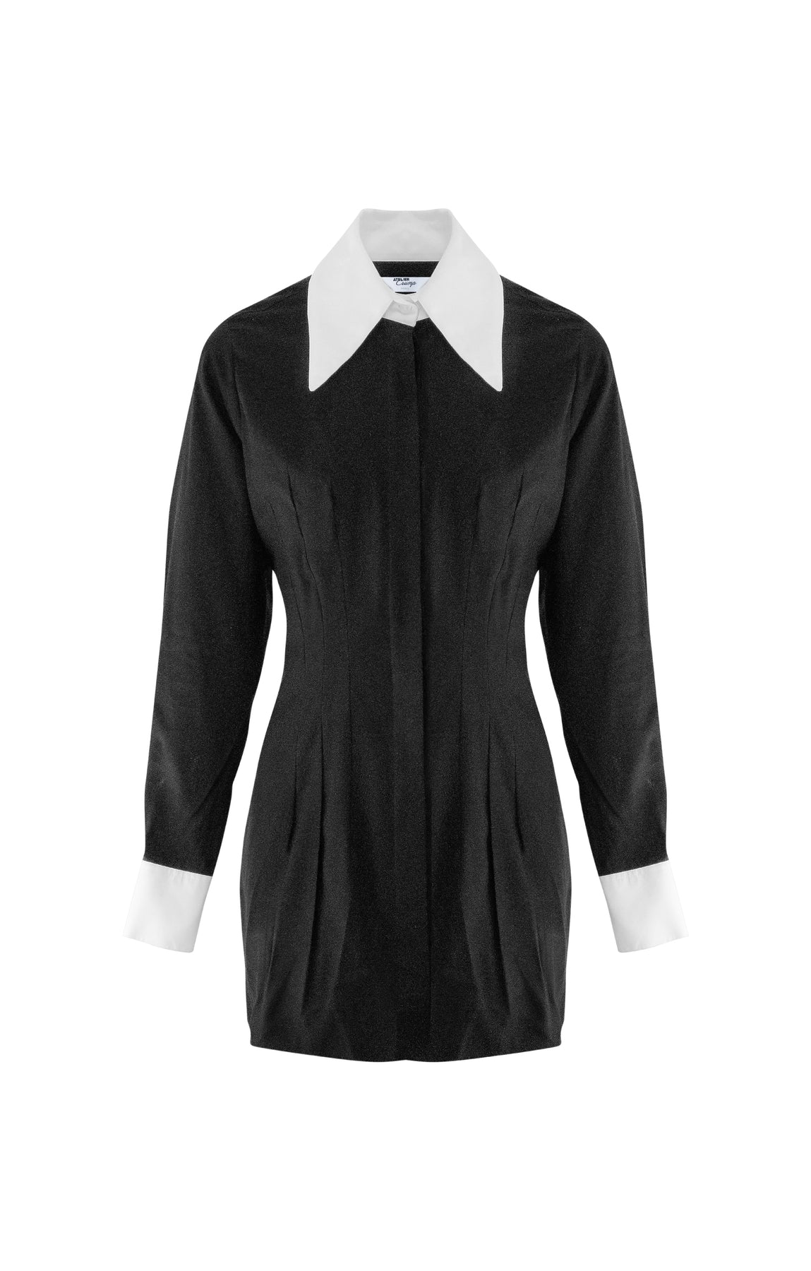 Vestido corto con detalles de pinzas que realzan la cintura, cuello camisero y puños en contraste. La modelo lleva una talla S y mide 1,75. Esta prenda es hecha en Colombia en condiciones de trabajo éticas.