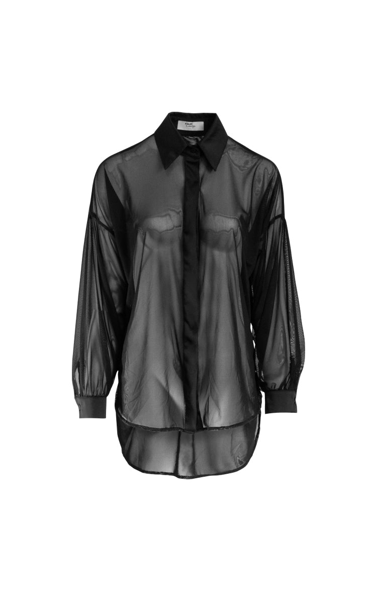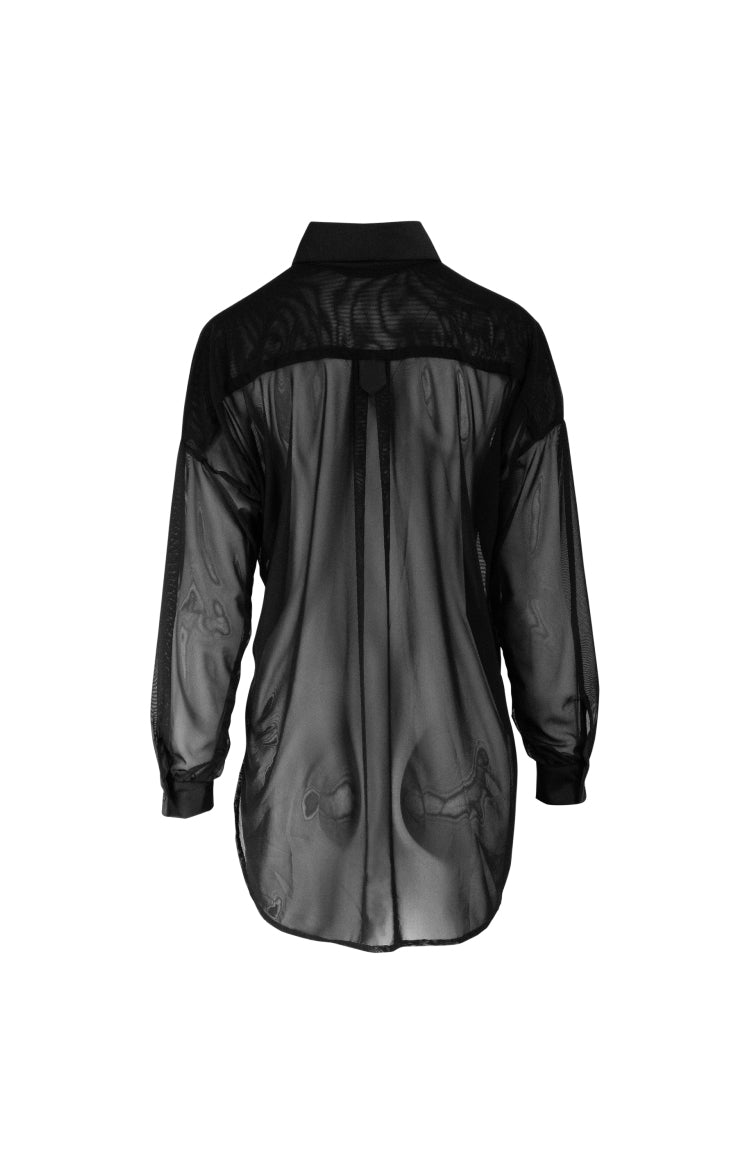 Camisa con horma clásica de cuello camisero imponente, La transparencia en contraste con el cuello y los puños le da un toque elegante y sofisticado. La modelo lleva una talla S y mide 1,75. Esta prenda es hecha en Colombia en condiciones de trabajo éticas.