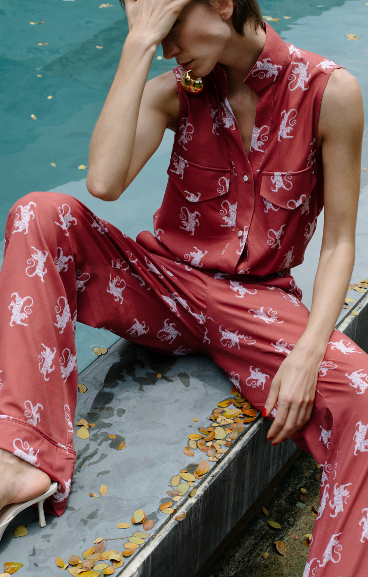 Camisa de cuello alto con escote en V y sin mangas, lo cual la convierte en una prenda versátil con diferentes opciones para elevar el look utilizando otras prendas como complemento. Con estampado de tigres sobre fondo color sangría perfecto para usar como un set completo con el pantalón tigres en el mismo color. Es una pieza suave al tacto. La modelo lleva una talla S y mide 1,75. Esta prenda es hecha en Colombia en condiciones de trabajo éticas.