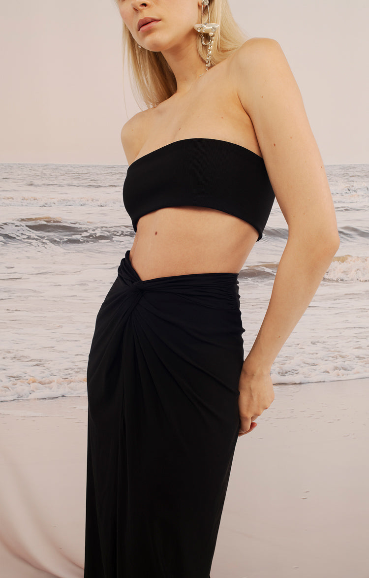 Falda larga con un detalle drapeado y abertura delantera. Su silueta es ajustada al cuerpo, elaborada en tela suave al tacto en color negro. La modelo lleva una talla S y mide 1,75. Esta prenda está hecha en Colombia bajo condiciones éticas de trabajo.