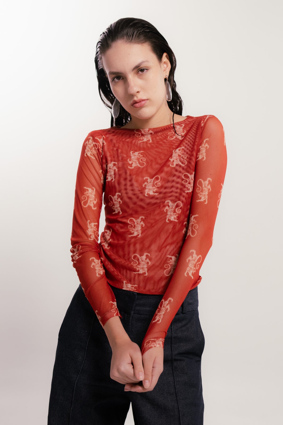 Top elaborado en mesh color sangría, con cuello redondo y manga larga. Su estampado de tigres la convierte en una pieza statement capaz de utilizarse en diferentes contextos. Perfecto para usar en set junto con el pantalón tigres sangría o como una prenda individual. La modelo lleva una talla S y mide 1,75. Esta prenda es hecha en Colombia en condiciones de trabajo éticas.