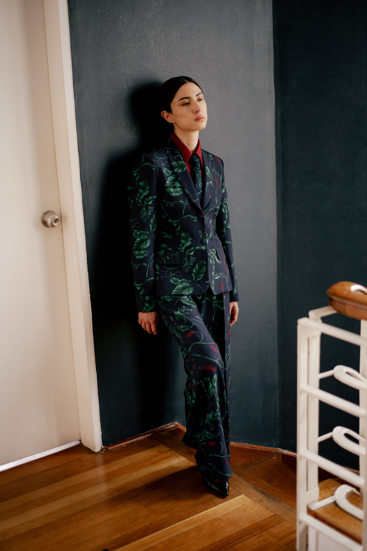 Blazer con entalle en la cintura y clásicas solapas, con un estampado que resalta sobre el fondo azul marino. Es una pieza statement gracias a su estampado único que evoca las profundidades del mar. La modelo lleva una talla S y mide 1,75. Esta prenda es hecha en Colombia en condiciones de trabajo éticas.
