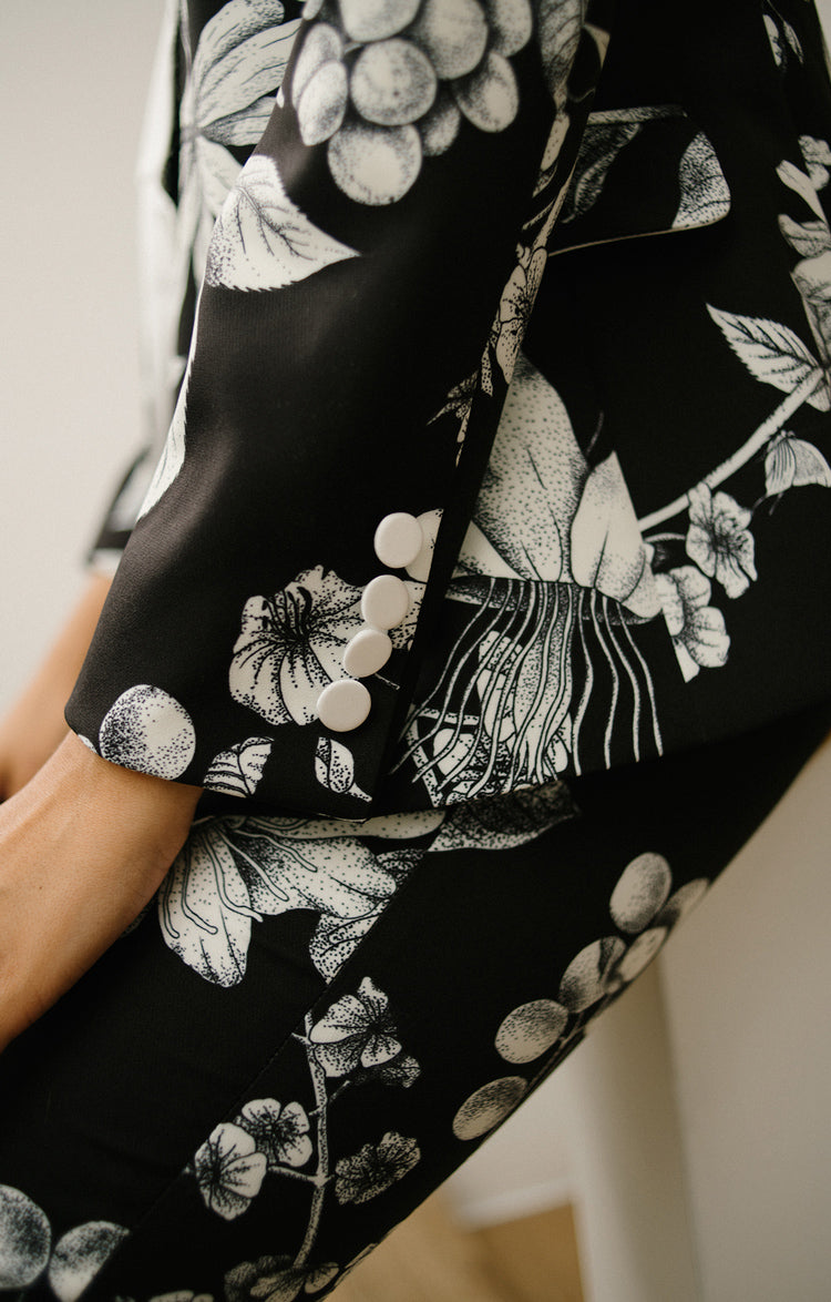 Pantalón clásico en crepé estampado. Silueta tipo sastre, de corte recto, con quiebre marcado y con bolsillos laterales. Este pantalón llega justo abajo del ombligo. La modelo lleva una talla S y mide 1,75. Esta prenda es hecha en Colombia en condiciones de trabajo éticas.