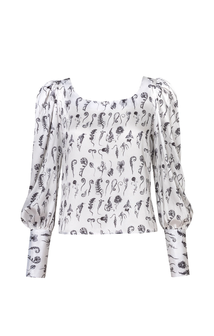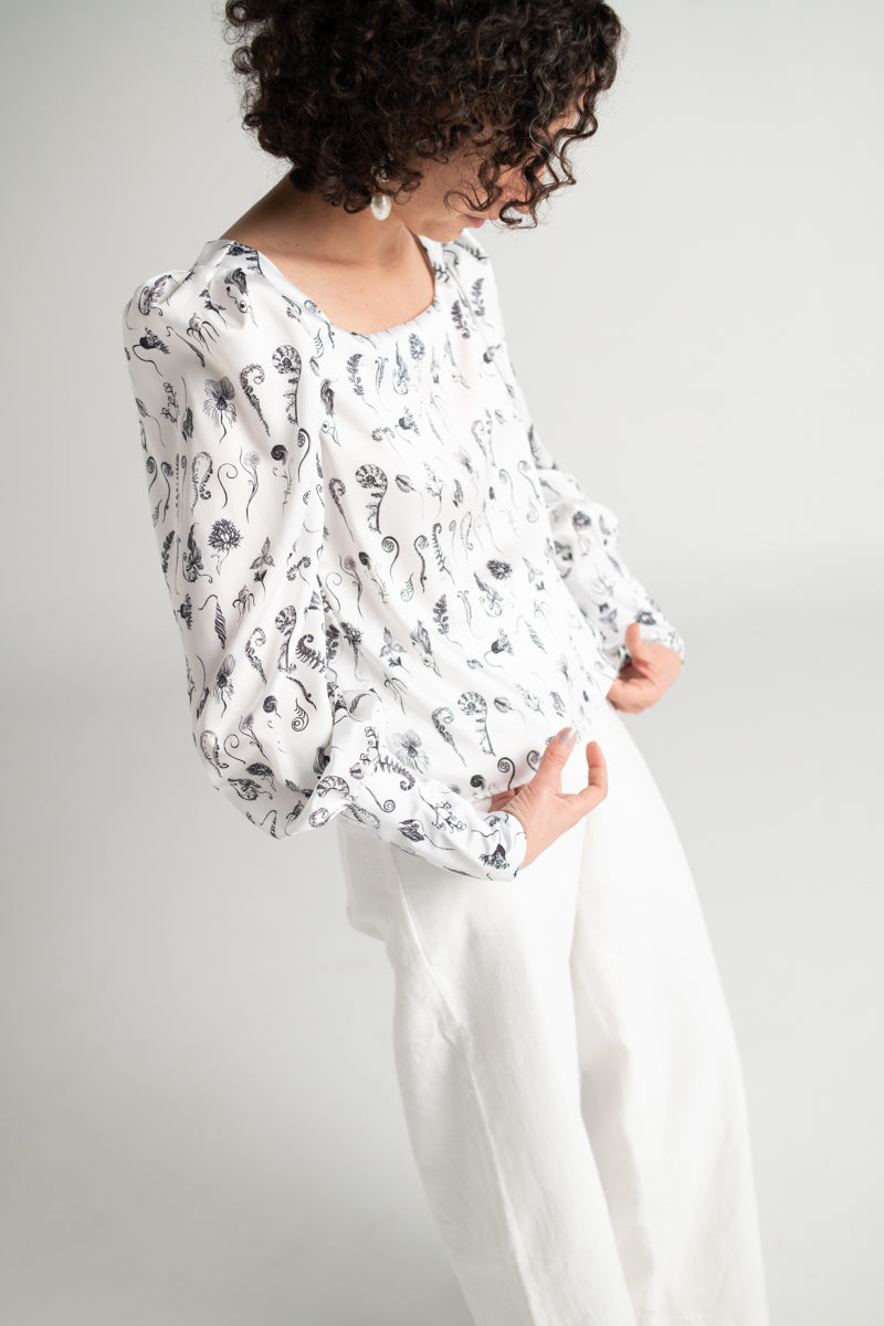 Top manga bombacha, con puño alto, cuello bandeja y abotonadura en la espalda. Elaborada en una base textil de poliéster reciclado. El fit de nuestro top es ideal para aquellas que quieren darle un toque diferente a su look. La modelo lleva una talla S y mide 1,75. Esta prenda es hecha en Colombia en condiciones de trabajo éticas.